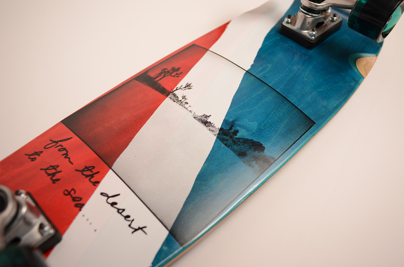 Split veneer top & bottom ply with film photo over white stripe to emphasize split veneer. From the Desert to The Sea hand drawn type.